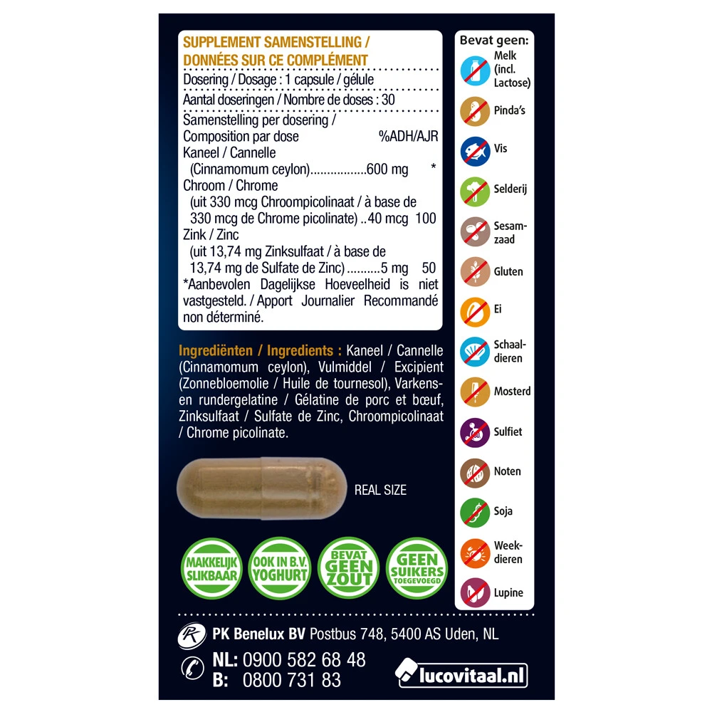 Lucovitaal Bloedsuikerspiegel CapsulesBloedsuikerspiegel Capsules van Lucovitaal bevatten maar liefst 600 mg kaneel per gemakkelijk slikbare capsule. Kaneel helpt bij het handhaven van een normale bloedsuikerspiegel en een optimaal gewicht, en is goed voor de cholesterolspiegel. Kaneel ondersteunt tevens het hart en de bloedsomloop.Deze samenstelling bevat naast kaneel ook chroom, dit zorgt mede voor het behoud van een normale bloedsuikerspiegel. Ook draagt chroom, net als zink, bij aan een norm