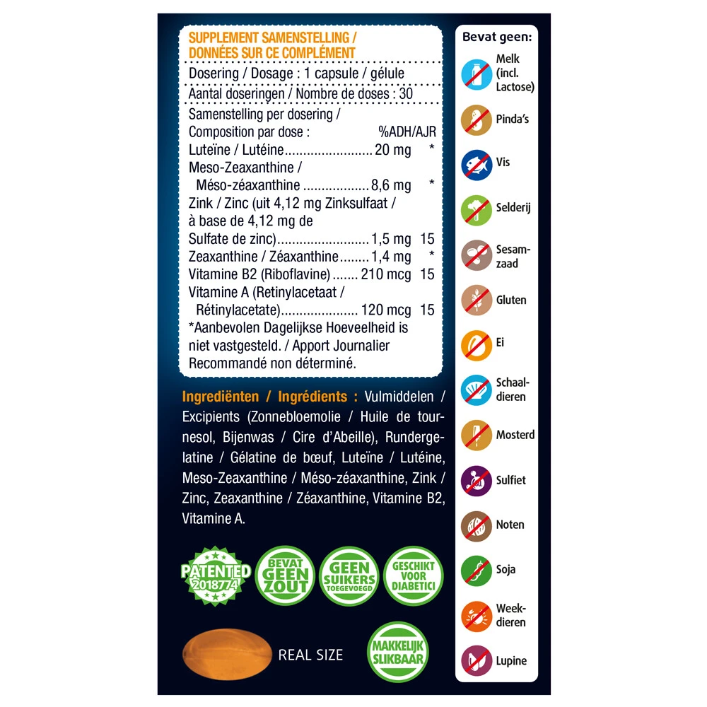 Lucovitaal Ogen, Scherp zien & VochtbalansOgen, Scherp zien & Vochtbalans van Lucovitaal is een unieke een-per-dag formulie met onder andere Luteïne, Zeaxanthine en Meso-Zeaxanthine. Het helpt bij droge ogen en voor scherp zicht. Bevat vitamine A wat bijdraagt aan de instandhouding van een normale vochtbalans in de ogen. In makkelijk slikbare capsulesVitamine A draagt bij tot de instandhouding van een normale vochtbalans van de ogen en ondersteunt de conditie van het oog. Het helpt om scherp te