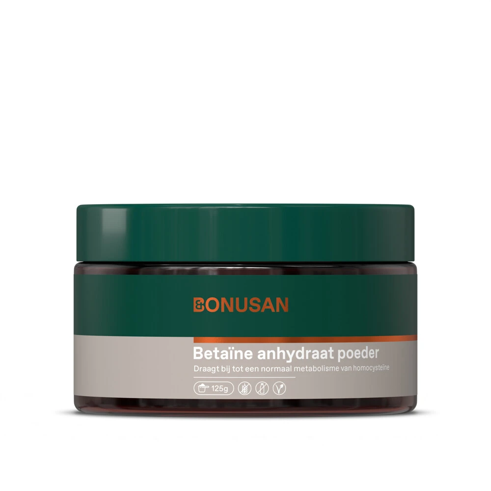 Bonusan Betaïne anhydraat poederHomocysteïne is een in hoge concentraties giftig stofwisselingsproduct. Betaïne levert dankzij een uniek werkingsmechanisme een belangrijke bijdrage aan het behoud van een normale homocysteïnestofwisseling.Voor een normale homocysteïnestofwisselingZuiver poeder uit suikerbieten, vrij van hulpstoffenGemakkelijk oplosbaar in water of vruchtensapGoede combinatie met vitamine B6 plus 50 mg en SAMe-400Bij een inname van 1,5 gram per dag draagt betaïne bij tot een