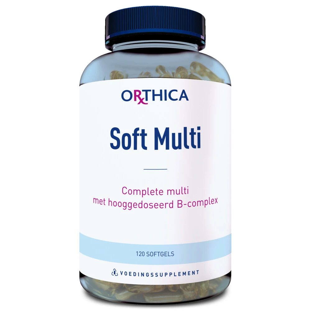 Multivitamine met hoog gedoseerde B Complex Orthica Soft multi is een multivitamine die extra vitamine B complex bevat. Vitamine B complex ondersteund het lichaam bij een geestelijke inspanning en moeheid. De softgel is gemakkelijk in te nemen door de gladde buitenkant. De vloeibare inhoud maakt deze softgel licht verteerbaar. Geschikt voor iedereen vanaf 12 jaar.