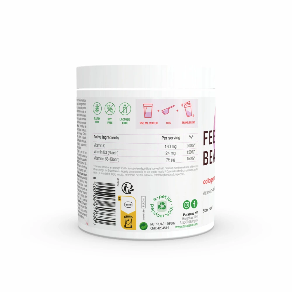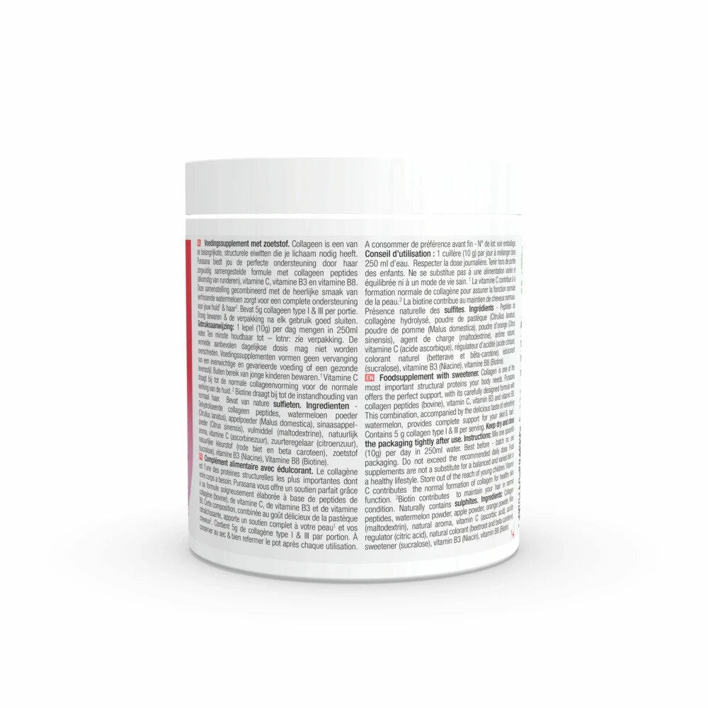 Purasana Collageen Watermeloen Huid, Haar en Nagels Purasana Collageen Watermeloen Huid, Haar en Nagels is een voedingssupplement met zoetstof. Collageen is een van de belangrijkste, structurele eiwitten die je lichaam nodig heeft. Purasana biedt jou de perfecte ondersteuning door haar zorgvuldig samengestelde formule met collageen peptides, vitamine C, vitamine B3 & vitamine B8. Deze samenstelling gecombineerd met de heerlijke smaak van verfrissende watermeloen zorgt voor een complete