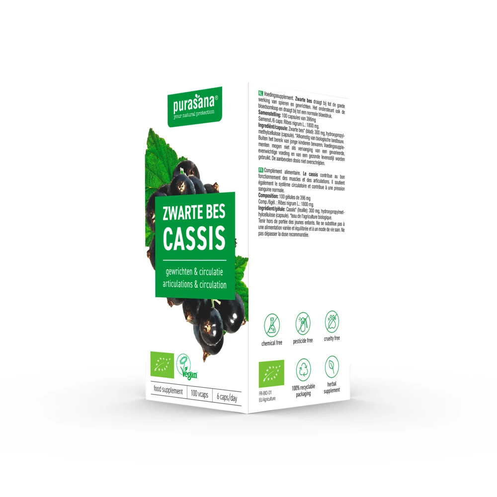 Purasana Zwarte Bes 300 mg Zwarte bes is een bekende plant die in grote delen van Europa en Azië voorkomt. Je kunt er jam van maken en het wordt gebruikt voor het maken van cassis. Purasana Zwarte bes wordt gemaakt van de bladeren van de zwarte bes, ook wel bekend als ribes nigrum.Voor het behoud van soepele gewrichten*Draagt bij tot de normale werking van spieren*Helpt op gewicht te blijven**Gezondheidsclaim in afwachting van goedkeuring door de Europese Commissie