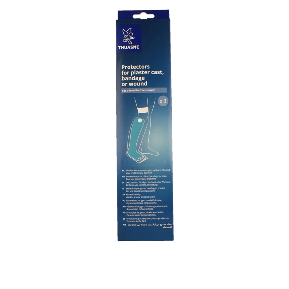 Probleemloos douchen met Thuasne Beschermhoes VoetThuasne Beschermhoes Voetbeschermt het gips, verband of een wond tijdens het douchen als deze niet nat mag worden. De hoes is voorzien van soort tape zodat je de hoes makkelijk kunt bevestigen en het gips, verband of een wond kunt beschermen tegen waterspatten.De verpakking bevat 3 hoezen die geschikt zijn voor de bescherming van de voet.