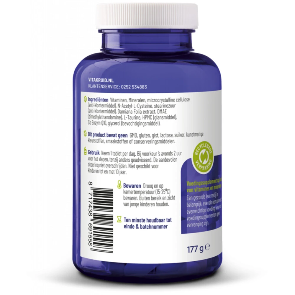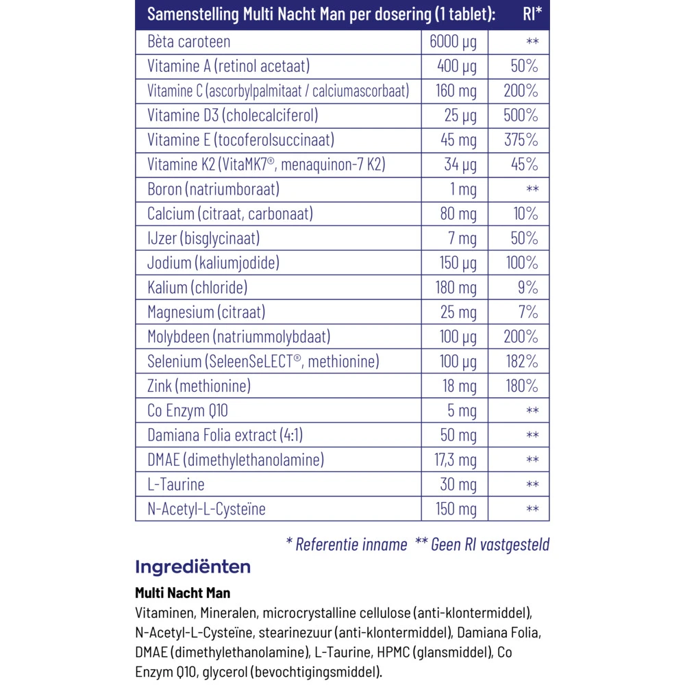 Vitakruid Multi Nacht ManVitakruid Multi Nacht Man bevat N-Acetyl-L-Cysteïne en Co-enzym Q10 wat belangrijke nutriënten zijn voor de man. De nachtformule van Multi Man bevat naast deze antioxidanten ook onder andere vitamine D3, voor de opbouw van sterke botten en vitamine A* en voor het herstellend vermogen van de huid*. Bovendien is er een natuurlijke libido ondersteuner toegevoegd*. Uitgekiende formule speciaal voor de nachtZink & SeleenSeLECT® zijn goed voor het sperma
