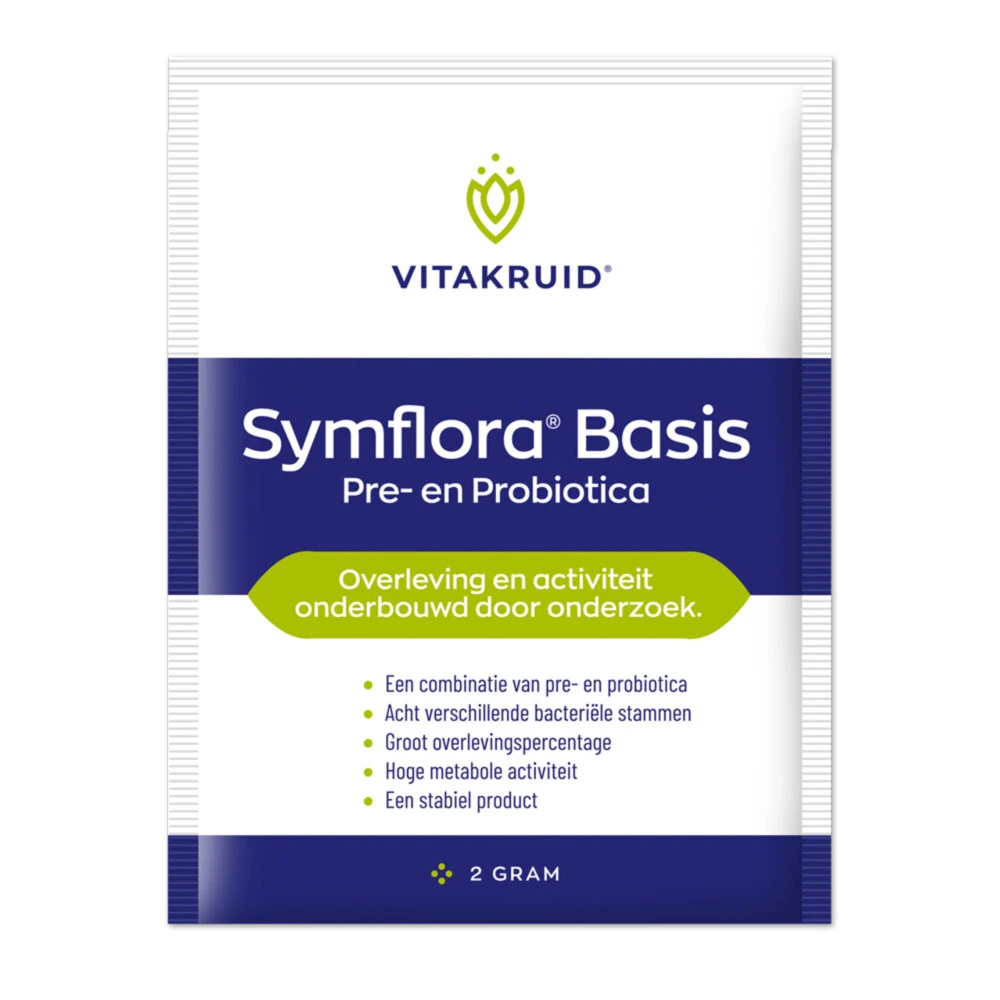 Vitakruid Symflora BasisVitakruid Symflora Basis bevat 8 verschillende bacteriële stammen. Uit onderzoek blijkt dat een probioticum met meerdere stammen effectiever is dan een probioticum met slechts één stam. Je kunt het zien als een team van mensen met verschillende achtergronden, die elkaar kunnen helpen en aanvullen door hun verschillende kwaliteiten. Symflora Basis heeft een formule met maar liefst acht stammen. Door Symflora Basis te verpakken in sachets heeft deze de op
