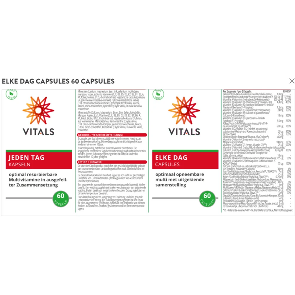 Vitals Elke DagBij de samenstelling van Vitalis Elke Dag is zoveel mogelijk gekozen voor goed opneembare stoffen en verbindingsvormen, in de juiste verhoudingen en in doseringen die ertoe doen. De samenstelling van Vitalis Elke Dag bevat naast de gewone vitaminen en mineralen essentiële micronutriënten en andere bijzondere stoffen (zoals luteïne, zeaxanthine, bioflavonoïden en co-enzym Q10.In een plantaardige capsule aangevuld met hulpstoffen uit natuurlijke broVoor tieners (
